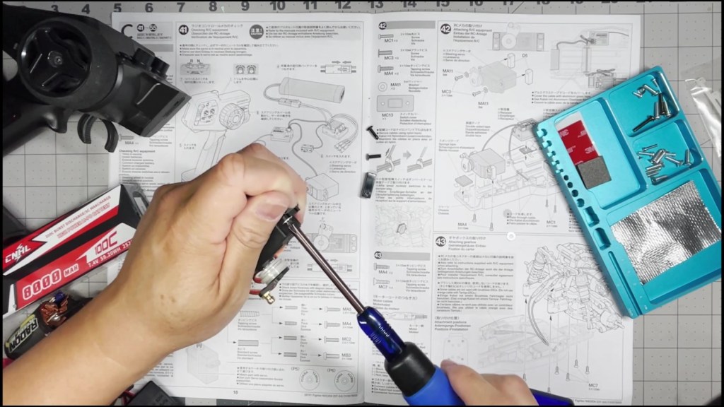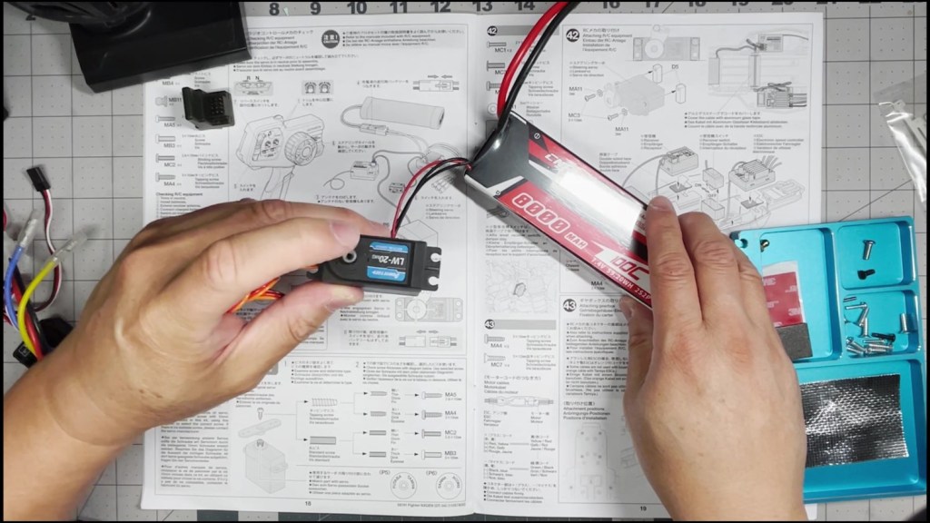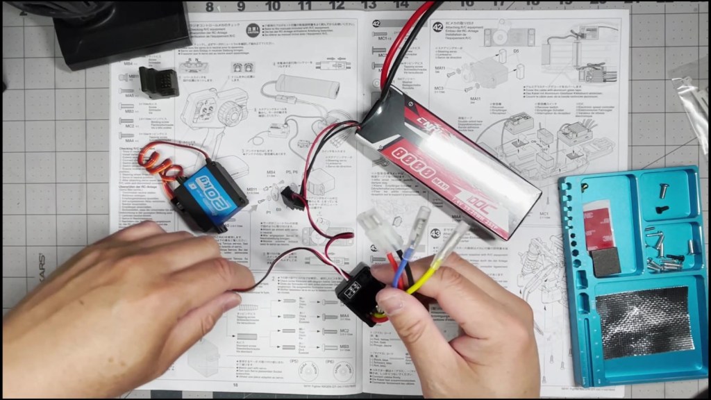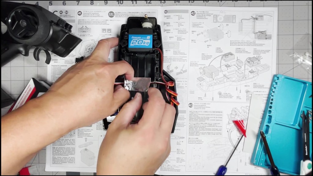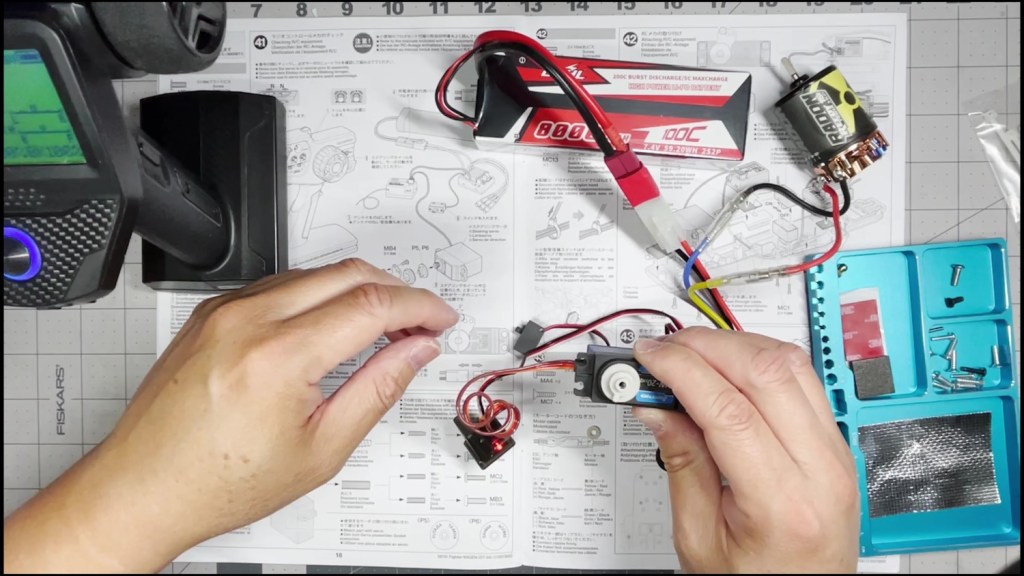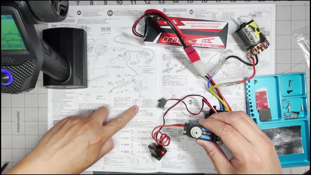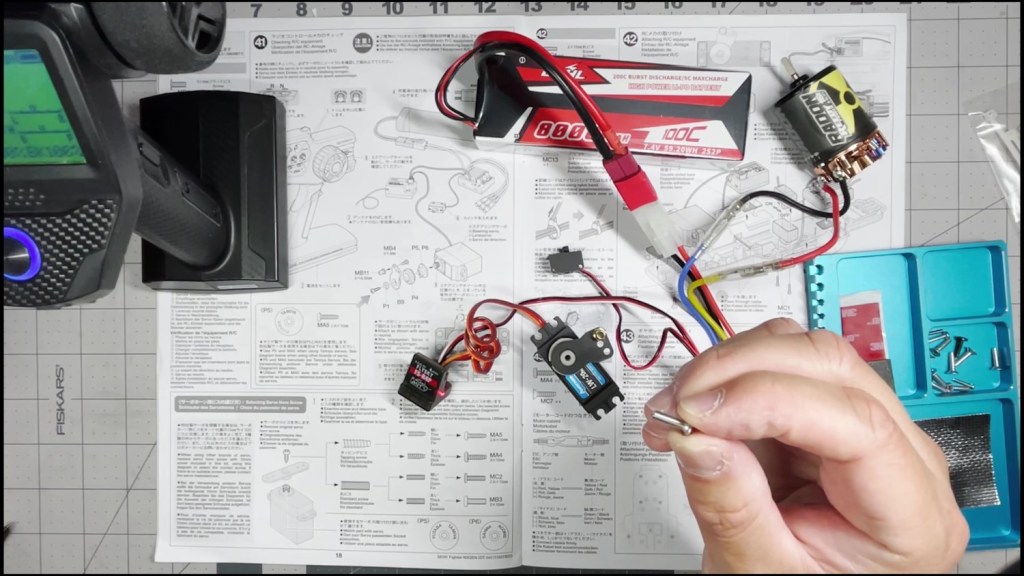 The first step is to connect the electronics and test them. This makes sure our transmitter and receiver are paired together. This step also centers the servo so make sure your trim settings are at zero before installing the servo saver.