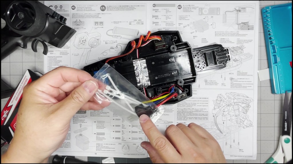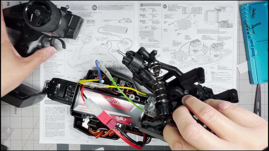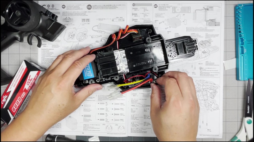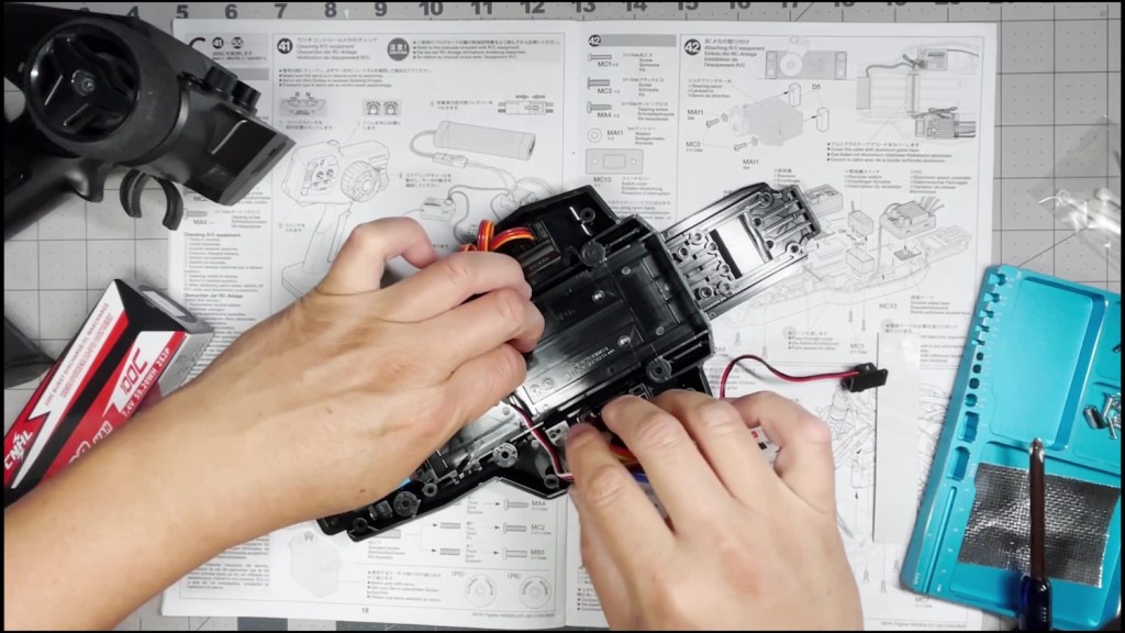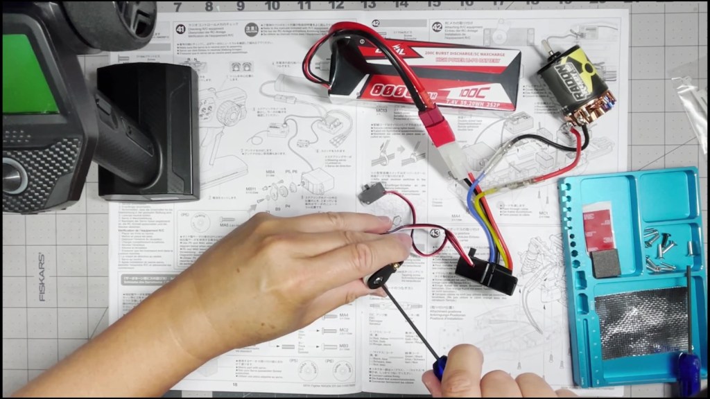 Repeat with the ESC on the other side of the chassis. Thread the receiver wire under the battery compartment to reach the receiver.