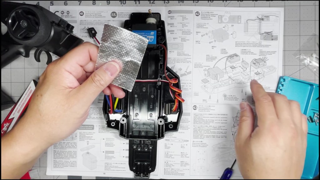 Cut out a piece of the double-sided tape to fit the receiver. Tape down the servo into the chassis in the location as shown.