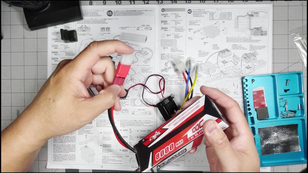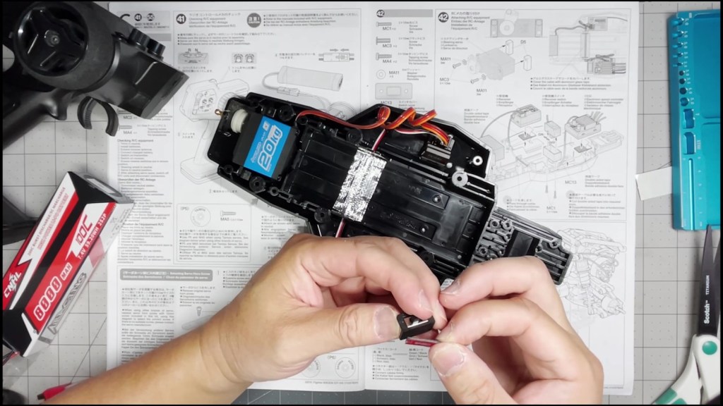 The electronic speed control or ESC does exactly what it says. It brings in power from the battery and controls the speed and direction of the motor. This Tamiya RC kit comes with a Hobbywing 1060 ESC2. The receiver3 receives the driver’s input from the transmitter. It directs the servo and ESC to respond accordingly. The battery4 is the on-board source of power for the electronics in the chassis. We are using a Deans to Tamiya connector adapter5 to connect the battery.