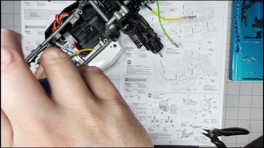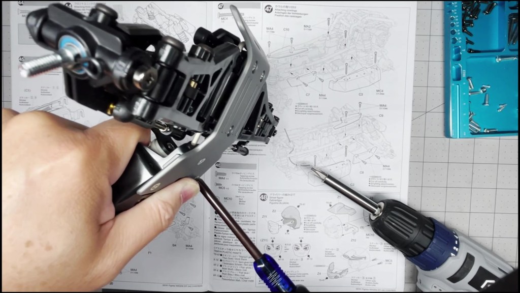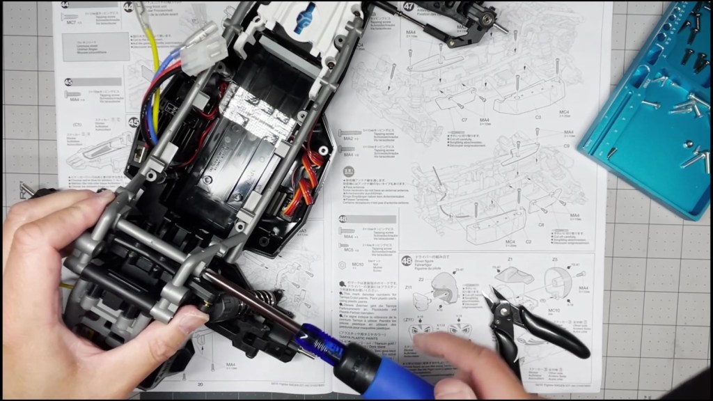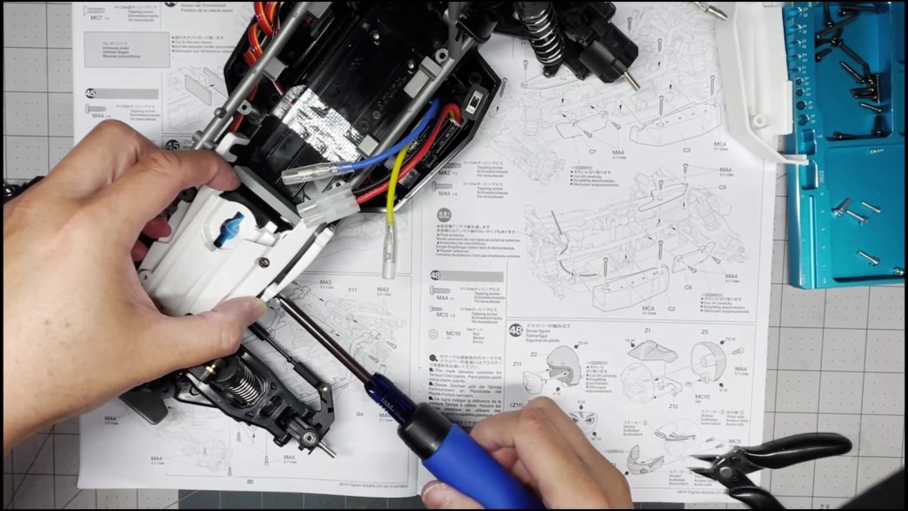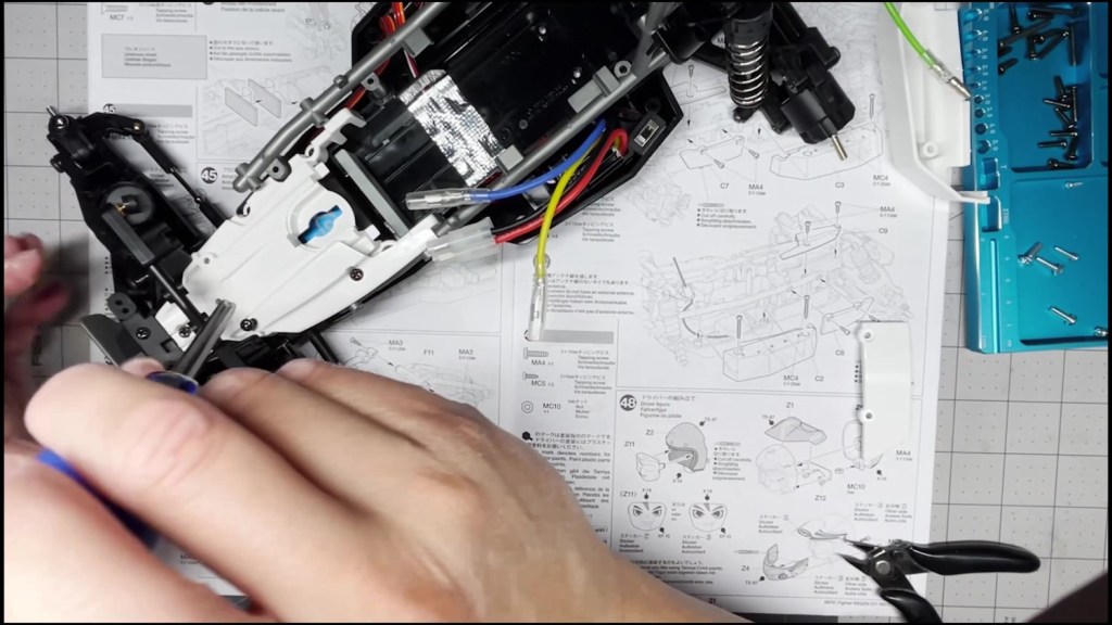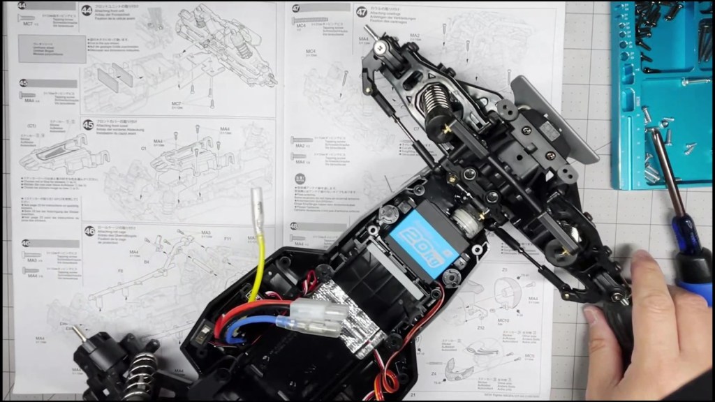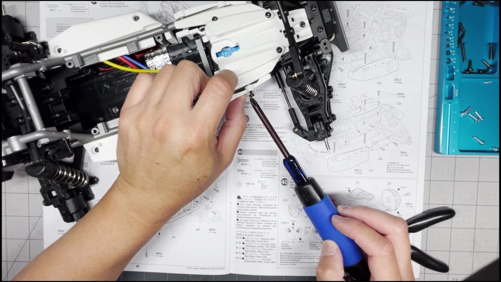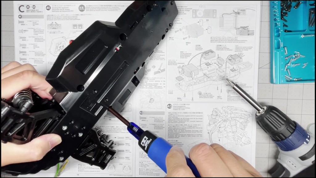 We are going to attach the front and rear ends to the tub chassis. We will also attach the roll cage and several body panels. There are a lot of screws in the part of the build. An electric screwdriver is recommended.