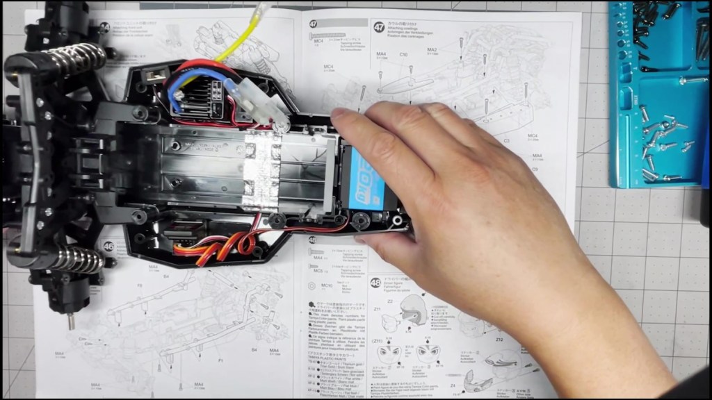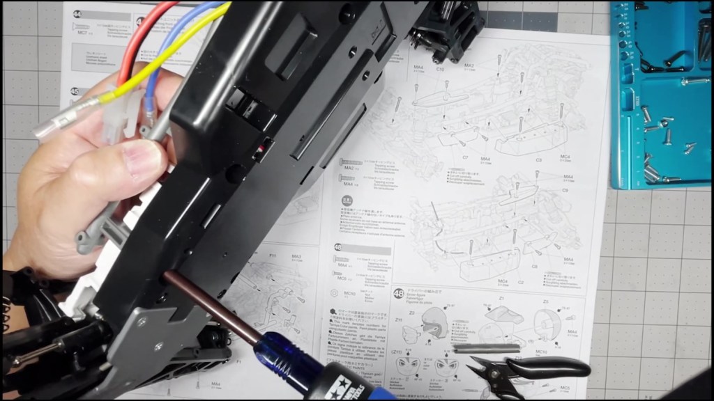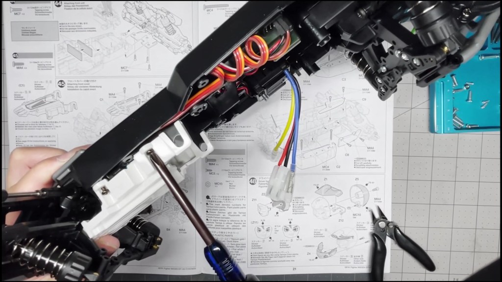 Let’s start by attaching the gearbox to the tub chassis. This step takes a total of six screws. Make sure to use the proper screws for each attachment point. Don’t forget to connect the motor leads to the ESC afterwards like I did. I realized it much later when the chassis was complete.