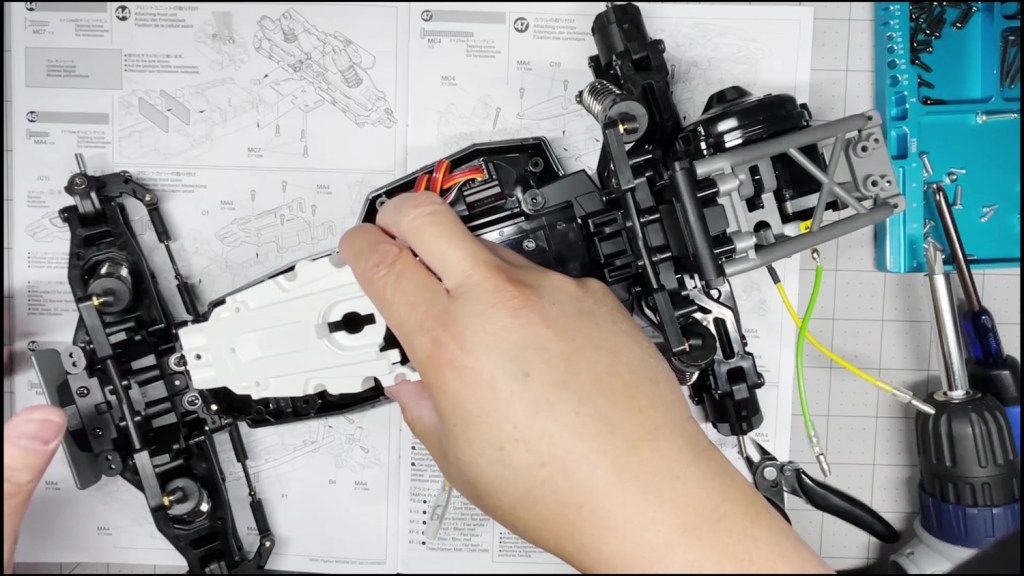 Attach the mid-body cover that goes over the ESC. We covered the on-off switch for now until the 3D printed adapter arrives.