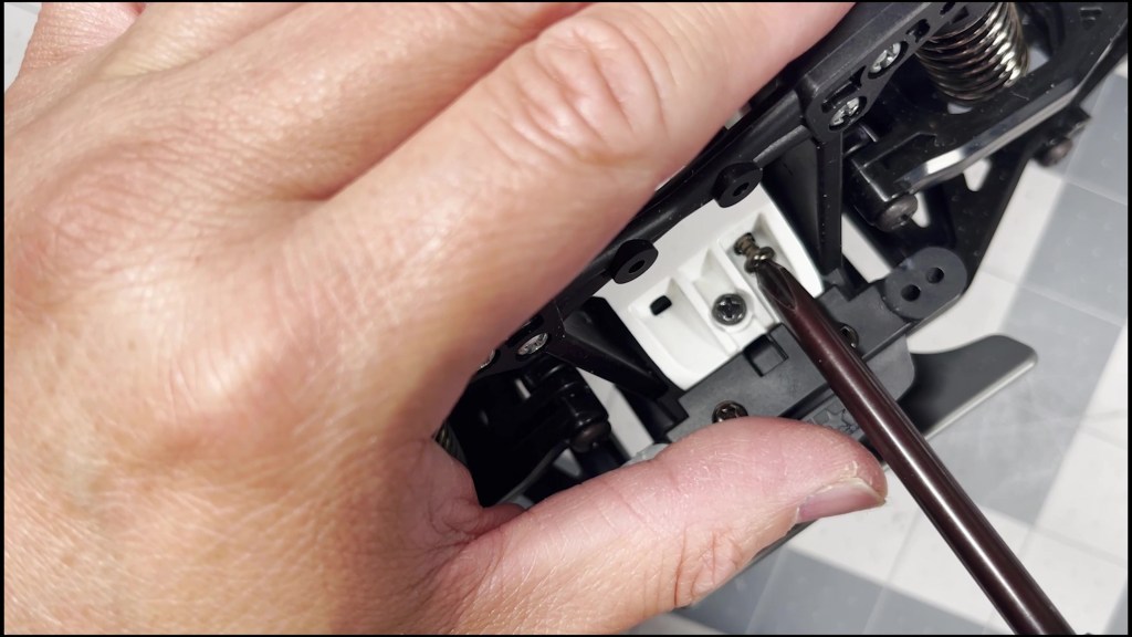 Place the nose piece of the body into place. It should seat completely flat on top of the tub chassis. Screw in 2 screws on each side to fasten it.